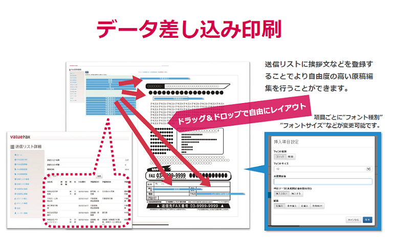 送信リストの情報を原稿のあらゆる場所へ差し込みが可能です。