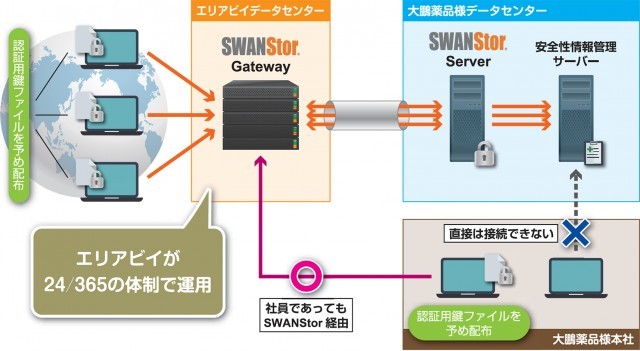 副作用情報を集計しレポート等を作成するために、社員も「安全性情報管理システム」にアクセスする事がありますが、例え社内に居る時であってもSWANStor経由でアクセスする事になっています(一部システム管理者等を除く)。 機密性の高い情報を扱うため、従業員に対しても、決められた人物のみにアクセス権限が与えられ、決められた方法でしかアクセスできない仕組みがSWANStorで構築されています。 また、今まではSWANStor Gatewayを当社のデータセンターに置き、自社で運用していましたが、ハードウェアの維持管理に手間と時間がかかるため、2014年よりSWANStor Gatewayをホスティングし、エリアビイジャパンで運用していただく事に変更しました。 多くの海外ユーザーが機密情報にアクセスする仕組みの運用を外部に委託する事は大きな決断でしたが、次の理由から委託を決定しました。 ○SWANStorは導入以来、10年以上ノートラブルだということ ○それまでのお付き合いの実績から、エリアビイジャパン社であれば委託することは問題ないということ インターネット上に存在するSWANStor Gatewayの運用はそれなりに気を使ったり、工数が必要です。 その運用をエリアビイジャパンに委託する事により、運用にかかる工数と費用を削減する事ができました。
