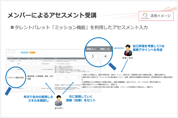 続いて実際の導入についてですが、まず人事システムや勤怠などとのサービス連携をしています。また適性検査のデータや、各メンバーの技術テストの結果データをタレントパレット上に取り込んで見える化し、データを見ながら人事育成施策を打てるような状態をつくっています。 具体的な流れとしては、メンバーは我々が作ったスキルマップに応じたアセスメント、もしくは外部の知識テストを受講します。この内容をデータとして取り込み、メンバー・マネージャーが分析。なおマネージャーはメンバー各個人のデータだけでなく、組織全体やユニット全体の傾向も見られるようにしています。 また、スキルマップの定義内容自体をタレントパレットに全て反映しています。たとえばメンバーがアセスメントを受講することで、「人に教えるぐらいのレベルで仕事ができるか」「もしくは全くできないか」など4~5段階の評価が下されるようになっています。さらに今年の課題を本人と上司がそれぞれ設定し、アセスメントとして集約する仕組みにしました。 アセスメントを受けた後で、各メンバーが「自分自身は会社全体の中で見たらどうか」もしくは「自分自身の評価に対して上司の評価はどうなのか」など各領域でのレベルをレーダーチャートで見られるようにしています。 合わせて、上司は自部門のメンバーがスキルと年齢、スキルと人事グレードの分布図においてどこに位置しているか、会社全体と比較するとどうかを見ることも可能です。 今後の展開としては分析や可視化を目的にするのではなく、きちんと施策につなげることをより強化していきたいと思っています。 言い換えると、課題を見える化した上で目標設定スキームを年間サイクルでしっかり回すことですね。明確になった課題に応じてメンバーと上司が目標設定を立て、半期ごとにメンバーのスキルが上がっているかをチェックします。上司は適切な機会をアサインできているかを振り返りつつサイクルを回していくことが大切かなと思います。 加えて検討中の施策が2点あります。 1つ目は評価補正情報の展開。これは年に1回、等級を決める最終評価の際、上司目線の評価だけでなくグレードや他メンバーと比較した場合の活躍度をもとに「本当にその評価でよいのか?」と考えてもらう段階を設けるというものです。 2つ目はマネージャー育成計画です。これは定義モデルやスキルモデルで可視化されたデータを踏まえての、施策アクションを行おうと設計している段階です。 検討中の内容もお話ししましたが、導入した施策によって各社員がキャリアの方向性や選択肢を明確にできるような効果があったと考えています。また、マネージャー側に対しては、課題意識の醸成やつくり上げたデータをもとに適正な評価をする会社視点が養われてきたように思います。 会社組織としては、事業計画に紐づいて「何年後にどういったレベルの人材がどれぐらい必要か」を組み込んだ人材育成・採用ができるようになりました。今後はタレントパレットの中に育成シートのようなものを実装し、そのフィードバックを蓄積していこうと思っています。 さらに、こうした動きを全社展開していくこと、個々人に対して学びの機会をレコメンドしていくこと、会社の戦略に合わせた新たなスキルセットや職種などを、順次拡充していきたいですね。 今回ご紹介させていただいたようなスキルマップの可視化や人材アセスメントの精度向上といった内容を実装したいのであれば、タレントパレットなら幅広く対応できるという手応えを感じています。また、機能の豊富さや分析の深さを重視するならおすすめですね。